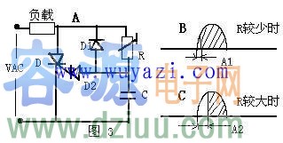 相位觸發電路實際上是交流觸發電路的一種,如圖3,這個電路的方法是利用RC回路控制觸發信號的相位。當R值較少時,RC時間常數較少,觸發信號的相移A1較少,因此負載獲得較大的電功率;當R值較大時,RC時間常數較大,觸發信號的相移A2較大,因此負載獲得較少的電功率。這個典型的電功率無級調整電路在日常生活中有很多電氣產品中都應用它。