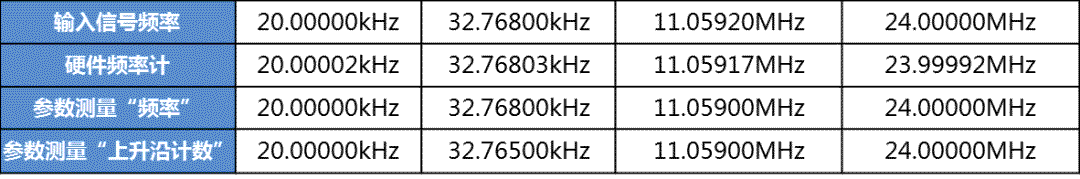 可見三者測量結(jié)果差異不大,硬件頻率計的分辨率更高,而參數(shù)測量中有效位數(shù)只有5位。此信號發(fā)生器輸出頻率的準(zhǔn)確度為±1ppm,示波器內(nèi)部晶振的頻率準(zhǔn)確度為±2ppm,在上述的24MHz硬件頻率計中,測量的準(zhǔn)確度為80Hz/24MHz=3.33ppm,基本在儀器的測量精度內(nèi)。參數(shù)測量值在某些情況下顯得更接近真實(shí)值,這是因?yàn)槠溆行粩?shù)不夠而四舍五入的原因,準(zhǔn)確度更高的還是硬件頻率計。