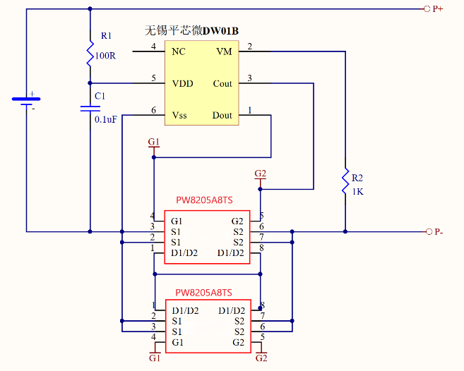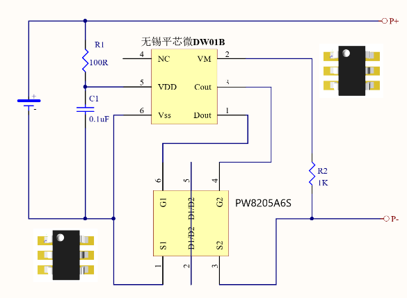 DW01B, 特點:外置MOS(PW8205A6S或者PW8205A8TS),由于是外置MOS,過充電電流和過放電電流可通過 很 多 個MOS并聯(lián)來提高,這是很常見的,采用SOT23-6封裝。