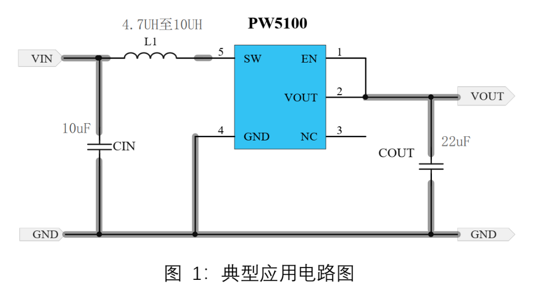 PW5100 的工作頻率高達(dá) 1.2MHz,其目的是為了能夠減小外部的電感尺寸和輸出電容容值,故 PW5100 只需要 1uH 以上的電感就可以保證正常工作,