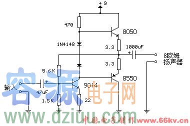 本電路是一個小的音頻放大器類似于一個小的晶體管收音機。輸入級可偏置電壓,使供應分在兩個互補輸出是略微偏導基地之間的二極管三極管平分。 3.3歐姆的電阻串聯(lián)使用,輸出晶體管的發(fā)射極穩(wěn)定的偏置電流,因此不