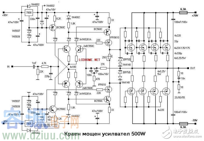 幾款不錯的電路圖 場效應管多管并聯(lián)輸出,500W。 場管跟普功率最大不同就是場管是用電壓驅(qū)動,在驅(qū)動級上有些不一樣,沒弄過場管功放,音質(zhì)怎要看你設計和工藝! IRFB33N15D是一顆非常好的MOS管