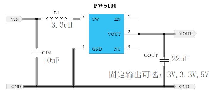 PW5100 的工作頻率高達 1.2MHz,其目的是為了能夠減小外部的電感尺寸和輸出電容容值,故 PW5100 只需要 1uH 以上的電感就可以保證正常工作,
