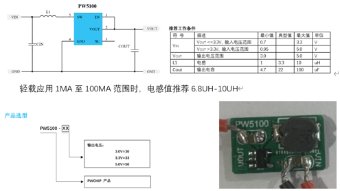 PW5100可以實現2.4V轉3.3V,2V轉3.3V的穩壓電源電路,輸出電流500MA.靜態電流10uA,SOT23-5封裝。輸出紋波低,輕載性能高(輕載電感推薦6.8UH-10UH).PW5100 是一款高