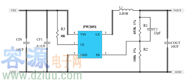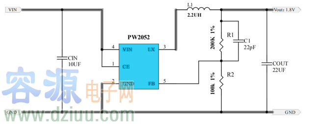 PW5100 的工作頻率高達(dá) 1.2MHz,其目的是為了能夠減小外部的電感尺寸和輸出電容容值,故 PW5100 只需要 1uH 以上的電感就可以保證正常工作,