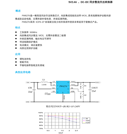 1、PW6276是一顆高效同步升壓轉換芯片,內部集成低阻抗功率 MOS。 具有短路保護功能內集成軟啟動電路,無需外部補償電容,外部反饋網絡。