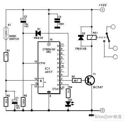 采用CD4017磁簧/干簧接近開關傳感器電路圖