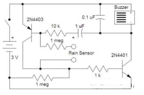 下雨(雨水)探測器電路原理如圖。這個電路使用了一個傳感器,傳感器是用一小塊敷銅板蝕刻而成,這個是一個簡單可控硅電路用來檢測下雨,并發(fā)出蜂鳴聲。可控硅也可用來觸發(fā)一個繼電器,打開一盞燈,或者發(fā)送一個信號到安全系統(tǒng)。