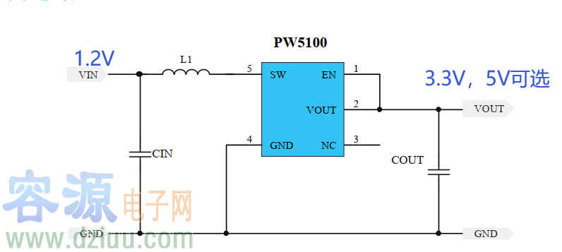 PW5100-1.5V升3.3V芯片電路圖,穩壓3.3V供電MCU模塊等