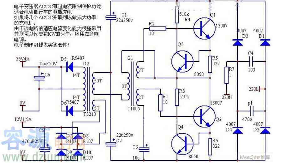 我們經過反復實驗這種電子變壓器的電流反應速度很快!已經超過了普通的工頻變壓器,該電路完全可以代替功放的電源。電子變壓器AC/DC有過電流限制保護功能適合電動自行車的電瓶充電。如果將幾個AC/DC并聯可以做成大功率的充電機。由于該電路的適應電流變化能力很強采用并聯可以代替數KW的火牛,應用在音響電源。