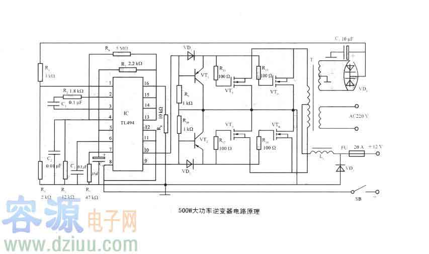 如圖為500W大功率變壓器電路原理。電路采用TL494為振蕩器,VT1~VT6為激勵級,是輸出為500W的大功率逆變電路。TL494在該逆變器中的應用方法如下:1、2腳構成穩壓取樣、誤差放大電路f逆變器次級繞組整流輸出的15V直流電壓作為取樣電壓,經R1、R3分壓,使1腳在逆變器正常工作時有近4.7~5.6V的取樣電壓。2腳輸入5V的基準電壓(由14腳輸出)。當輸出電壓降低時,1腳電壓降低,誤差放大器輸出低電平,通過TL494內部電路使輸出電壓升高。