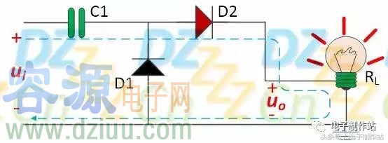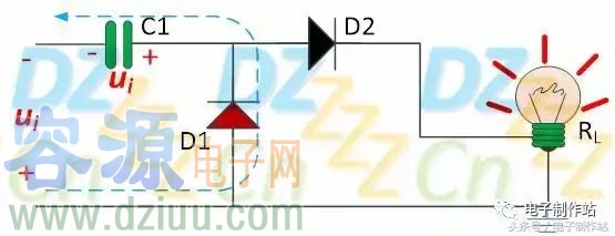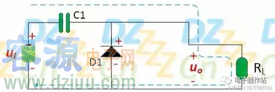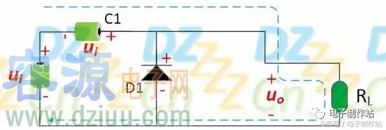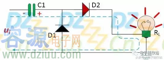 當電壓ui的第一個正半周來到時,電壓ui極性為上正下負,電壓ui經過電容C1給二極管施加反向偏置使其截止,同時給二極管D2正向偏置使其導通,電壓ui全部施加在負載上。