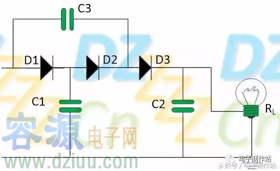 下圖是3倍壓整流電路,讀者可以嘗試分析一下: