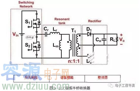 串聯(lián)諧振特性允許直流(DC)/DC LLC-SRC中的開關(guān)網(wǎng)絡(luò)(如圖2所示)擁有很寬范圍的零電壓開關(guān)(ZVS);因此,LLC-SRC能在前端電源應(yīng)用中輕松實現(xiàn)超過94%的效率,并能在高開關(guān)頻率下運(yùn)行。