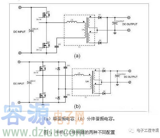 單諧振電容和分體諧振電容都存在于半橋轉(zhuǎn)換器當(dāng)中。對于單諧振電容配置而言,它的輸入電流紋波和均方根(RMS)值較高,而且流經(jīng)諧振電容的均方根流較大。這種方案需要耐高壓(600~1,500V)的諧振電容。不過,這種方案也存在尺寸小、布線簡單等優(yōu)點。