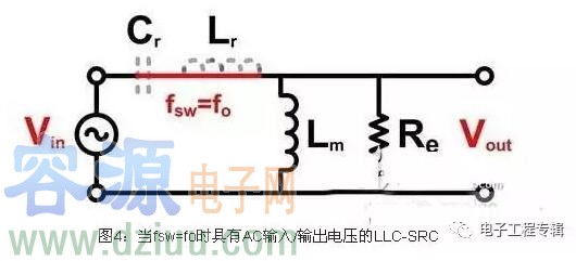 任何時候,在Mg/fn圖表中fn_min都需要高于增益曲線的脊線。這是為確保金屬氧化物半導(dǎo)體場效應(yīng)晶體管(MOSFET)能保持ZVS狀態(tài)。LLC-SRC的效率只能在一個操作點進(jìn)行優(yōu)化。當(dāng)fsw= fo時,串聯(lián)Lr和Cr變成零阻抗?fàn)顟B(tài)(圖4);該轉(zhuǎn)換器在那個點具有最高的效率。您需要決定自己想優(yōu)化的線路/負(fù)載條件,并確保您的開關(guān)頻率在那樣的條件下是諧振頻率。