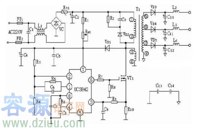 研制儀器需要一個能在0到3兆歐姆電阻上產生1MA電流的恒流源,用UC3845結合12V蓄電池設計了一個,變壓器采用彩色電視機高壓包,其中L1用漆包線在原高壓包磁心上繞24匝,L3借助原來高壓包的一個線圈,L2借助高壓包的高壓部分。L3和LM393構成限壓電路,限制輸出電壓過高,調節R10 可以調節開路輸出電壓。