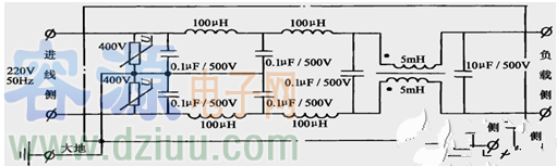 圖中的100H電感、0.1F電容組成高頻濾波器,用于吸收從電源線傳導(dǎo)進來的中短波段的高頻噪聲干擾;圖中兩只對稱的5mH電感是由繞在同一只鐵心兩側(cè)、匝數(shù)相等的電感繞組構(gòu)成的,稱為共模電感,用于吸收因電源波形畸變而產(chǎn)生的諧波干擾;圖中的壓敏電阻用于吸收因雷擊等引起的浪涌電壓干擾。 交流電源濾波器的內(nèi)部電路。容-源-電-子-網(wǎng)-為你提供技術(shù)支持