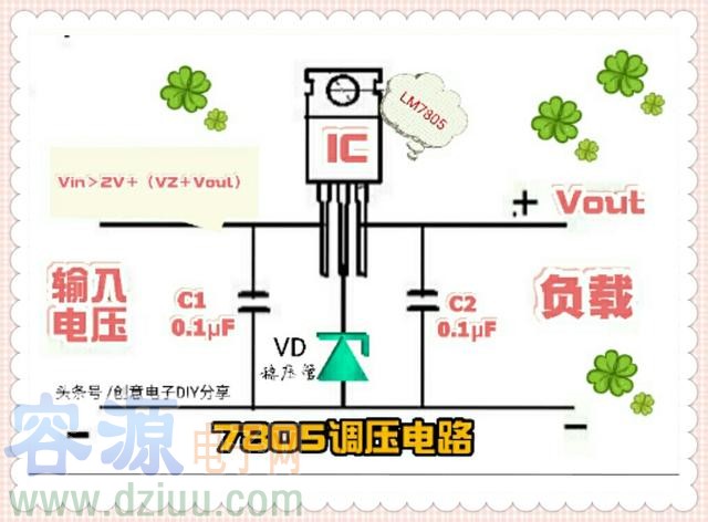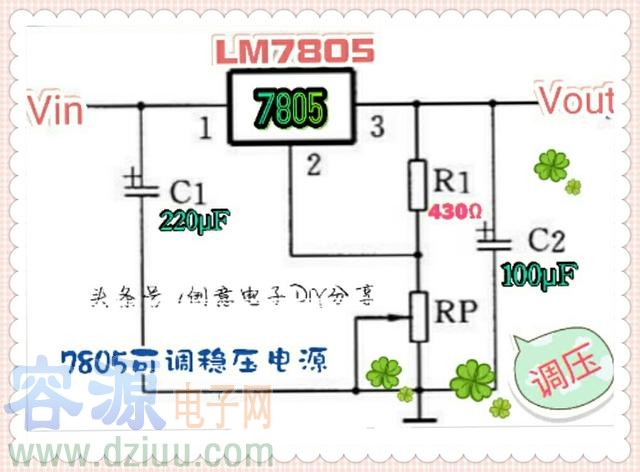 7805的典型應(yīng)用電路是輸出5V的固定電壓。實(shí)際中,我們有時(shí)候可能會(huì)用到一些非標(biāo)稱值的電壓。譬如需要一個(gè)7.8V的穩(wěn)定電壓,這時(shí)在7805外圍接兩個(gè)電阻即可將輸出的5V電壓抬高到7.8V。上圖中的輸出電壓Vout由電阻R1和RP決定。改變RP的阻值,即可獲得所需的輸出電壓。這里需要注意的是,要求Vin>2V+Vout。2V為7805正常工作時(shí)所需的最低壓差。