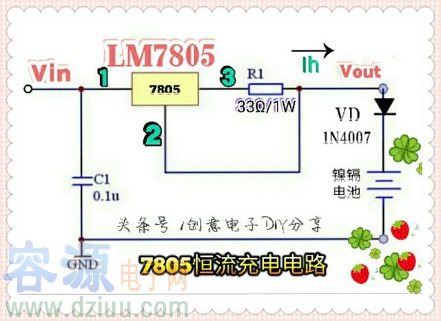 上圖中,7805、R1及VD構(gòu)成一個(gè)恒流充電電路。恒定電流(充電電流)Ih=5V/R1=5V/33Ω≈0.15A。改變R1的阻值,即可調(diào)整充電電流。圖中的1N4007為防倒流二極管。