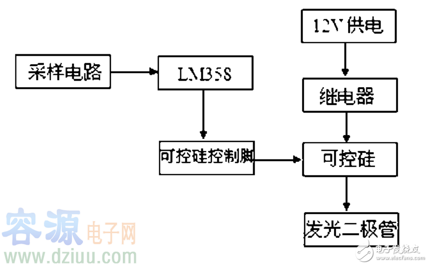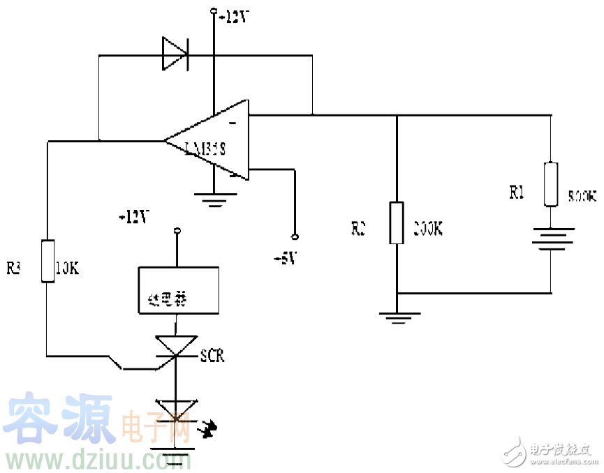 整個電路的原理如圖所示LM358、繼電器均用12V供電,LM358的反向輸人端接5V的參考電壓,采樣電路采用0一30V可調(diào)直流供電,整個電路按原理連接好后,當采樣電壓小于5V時,LM358輸出低電平,此時可控硅控制端的沒有正電壓,所以可控硅不導(dǎo)通,繼電器不工作,發(fā)光二極管不亮當采樣電壓大于5V時,LM358輸出高電平,此時,硅的控制腳得到一個正向電壓,此時,繼電器工作,發(fā)光二極管發(fā)光。說明可控硅已導(dǎo)通。此時再將采樣電壓降到5V以下,可控硅仍保持導(dǎo)通狀態(tài),說明這個電路已經(jīng)通過一個二極管被鎖住。容-源-電-子-網(wǎng)-為你提供技術(shù)支持