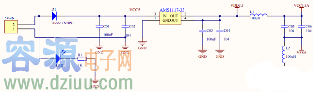 以下是用穩(wěn)壓芯片將5V的電源轉(zhuǎn)換成3.3V的電壓電路原理圖。