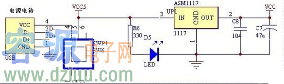 R6是D5的限流電阻,作用是使顯示發(fā)光二極管D5在上電時(shí)能工作在正常的狀態(tài)下;C7和C8都是輸出濾波電容,作用是減小輸出電壓汶波并抑制ASM1117的自激振蕩,C8是高頻濾波電容,C7是低頻濾波電容。圖中已經(jīng)標(biāo)出了C8容量是0.1微法,C7是47微法,R6的阻值是3030歐。