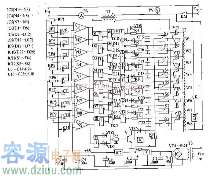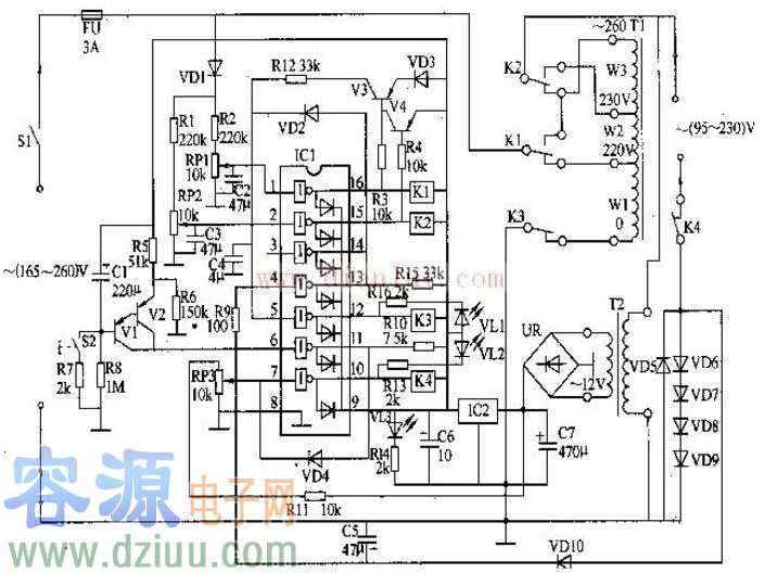 本例介紹的交流穩壓器,具有自動穩壓的功能,其輸人電壓范圍為交流120-260V,輸出電壓為交流220(1士10%)V,輸出功率為300-1000W(視自糯變壓器的功率和繼電器的觸頭電流容量而定)。容-源-電-子-網-為你提供技術支持