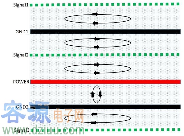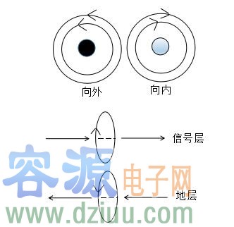根據麥克斯韋方程,分立的帶電體或電流,它們之間的一切電的及磁的作用都是通過它們之間的中間區域傳遞的,不論中間區域是真空還是實體物質。在PCB中磁通總是在傳輸線中傳播的,如果射頻回流路徑平行靠近其相應的信號路徑,則回流路徑上的磁通與信號路徑上的磁通是方向相反的,這時它們相互疊加,則得到了通量對消的效果。