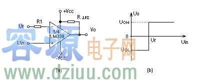 圖3為某儀器中過熱檢測保護電路。它用單電源供電,1/4LM339的反相輸入端加一個固定的參考電壓,它的值取決于R1于R2。UR=R2/(R1+R2)*UCC。同相端的