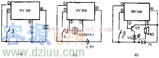 圖所示是HY-100系列音樂集成電路的應用電路,其中圖(a)所示電路是直接驅動揚聲器的一種門鈴電路,只要按動按鈕開關S,便可觸發電路工作。圖(b)所示電路是用壓電陶瓷片作為發聲元件的門鈴電路,由于壓電陶瓷片推