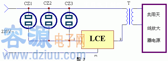 當電視機用的插座CZ1、CZ2、CZ3(當然還可以設計安裝更多的電源插座,只要所用的LCE功率允許)中的任意一只插有電視機的電源開關合上時,共用天線放大器的電源就自動供電。這樣既不會浪費電能,又不影響電視機用戶,且無須專人管理。