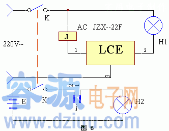 該裝置的應用電路工作原理見下圖。在一些不允許照明燈間斷的特殊場合(如正在做外科手術等),利用LCE模塊制作的停電應急照明燈自動轉換器可以達到停電后照明無間斷效果。其中H1是常態照明設備;H2是停電應急時的照明設備。