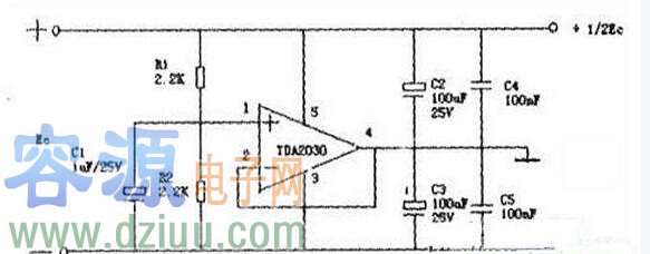 從上圖可以看出:把TDA2030接成電壓跟隨器的形式,正輸入端的兩個(gè)電阻把電源電壓的一半提供給le,le輸出端的輸出剛好是電源電壓的一半,把輸出作為虛擬的“地”,這個(gè)電路的特點(diǎn)是“虛地”,使用時(shí)“虛地”與輸入電源的接地端必須完全隔離。