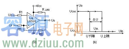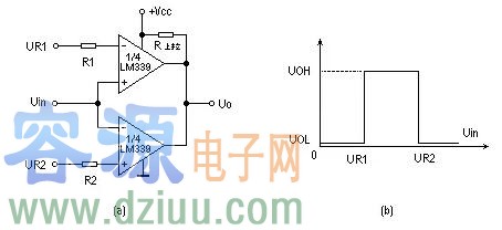 R1<Uin<UR2),輸出為高電位(UO=UOH)。當(dāng)Uin不在門限電位范圍之間時(shí),(Uin>UR2或Uin<UR1)輸出為低電位(UO=UOL),窗口電壓ΔU=UR2-UR1。它可用來判斷輸入信號(hào)電位是否位于指定門限電位之間。