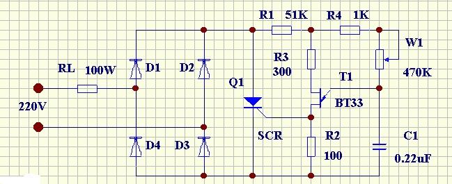 可控硅的同步觸發(fā)電路。當(dāng)調(diào)壓器接上市電后,220V交流電通過負(fù)載電阻RL經(jīng)二極管D1—D4整流,在可控硅SCR的A、K兩端形成一個脈動直流電壓,該電壓由電阻R1降壓后