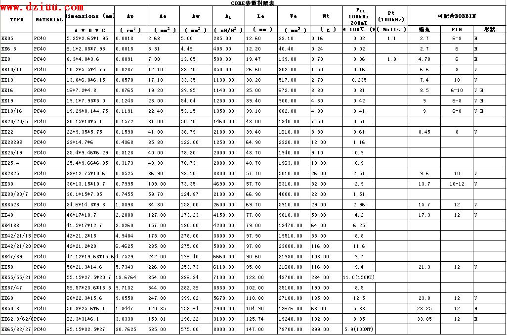 本文 收藏了EE型磁芯參數及尺寸資料,其中EE05;EE6.6;EE8;3310/11;EE13;EE16;