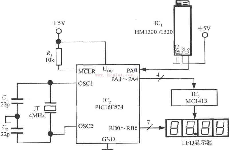 基于PIC16F874設(shè)計的電壓輸出式集成濕度傳感器電路如圖。 該儀表采用+5V電源,配4只共陰極LED數(shù)碼管。 電路中共使用了3片IC:IC1為HM1500/1520型濕度傳感器,IC2是由美國微芯片公