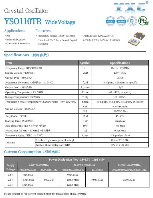 YXC晶振YSO110TR系列,頻率為25MHz,總頻差±20PPM,以下為YSO110TR系列規(guī)格書。