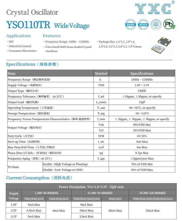 YXC石英振蕩器,頻點16MHz,工作電壓1.8V-3.3V,應用于