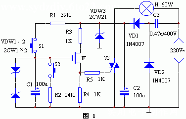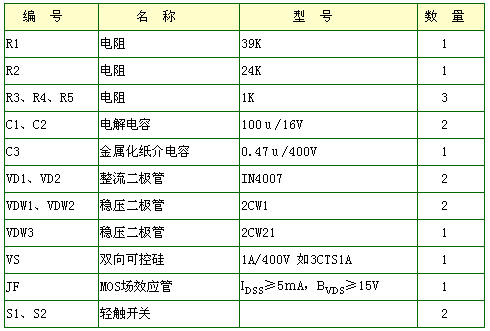 如圖所示,VD1、VD2、C2、C3組成電容降壓式直流電源,由MOS場(chǎng)效應(yīng)管、C1等組成雙向可控硅VS的觸發(fā)電路。DW為保護(hù)二極管,防止場(chǎng)效應(yīng)管柵極擊穿。當(dāng)按下S1時(shí),由R1向C1充電,使柵極電壓上升,雙向可控硅的觸發(fā)電流上升,導(dǎo)通角變大,光線增加,當(dāng)按下S2時(shí),C1沿R2放電,柵極電壓下降,雙向可控硅的導(dǎo)通角變小,光線變暗。當(dāng)S1、S2都放開(kāi)時(shí),由于MOS場(chǎng)效應(yīng)管的柵源電阻很大,C1兩端的電壓將基本不變,所以可控硅的導(dǎo)通角也將不變,光線穩(wěn)定下來(lái)。場(chǎng)效應(yīng)管JF的IDSS≥5mA,BVDS≥15V,可控硅VS選用1A/400V即可,如3CTS1A等。其它元件無(wú)特殊要求,具體數(shù)值已標(biāo)在圖中。電阻R1、R2的數(shù)值決定了電容C1的充放電時(shí)間。在制作時(shí),若光線變化太快時(shí),應(yīng)適當(dāng)增大R1、R2的數(shù)值,反之應(yīng)減小。電路實(shí)用性非常大,在制作調(diào)試時(shí),要耐心調(diào)試,一定會(huì)達(dá)到最佳效果。下面是元器件參數(shù)表: