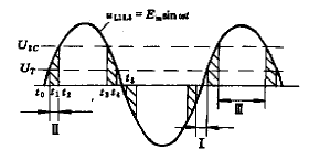 要指出的是所謂“過零”并非真的必須是電源電壓波形的零處,而一般是指在10~25V或-(10~25)V區(qū)域內(nèi)進(jìn)行觸發(fā),如圖2所示。圖中交流電壓分三個(gè)區(qū)域,Ⅰ區(qū)為-10V~+10V范圍,稱為死區(qū),在此區(qū)域中加入輸入信號(hào)時(shí)不能使SSR導(dǎo)通。Ⅱ區(qū)為10~25V和-(10~25)V范圍,稱為響應(yīng)區(qū),在此區(qū)域內(nèi)只要加入輸入信號(hào),SSR立即導(dǎo)通。Ⅲ區(qū)為幅值大于25V的范圍,稱為抑制區(qū)在此區(qū)域內(nèi)加入輸入信號(hào),SSR的導(dǎo)通被抑制。