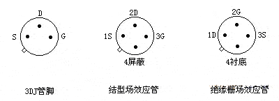 個管腳為漏極D和源極S(可互換),余下的一個管腳即為柵極G。對于有4個管腳的結型場效應管,另外一極是屏蔽