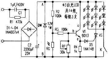 光控LED照明燈電路簡單,元器件少,用42支高亮白光發光二極管,把每3支串聯,然后在串聯在電路中,如圖,主要用于樓梯、過道等作照明使用。其工作原理如下:本文由www.mnu8.com整理提供,部分內容來源于網絡,如有侵犯到你的權利請與我們聯系更正。