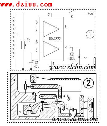 電路由音頻感應(yīng)線圈L、功放和耳塞三部分組成。功放集成塊選用TDA2822,該集成電路靈敏度高、功耗低,電壓范圍寬(1.8~15V),外圍元件少、無(wú)噪聲(