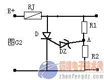 1. 可控硅應(yīng)用電路_直流可控硅觸發(fā)電路:如圖G2是一個(gè)電視機(jī)常用的過(guò)壓保護(hù)電路,當(dāng)E+電壓過(guò)高時(shí)A點(diǎn)電壓也變高,當(dāng)它高于穩(wěn)壓管DZ的穩(wěn)壓值時(shí)DZ道通,可控硅D受觸發(fā)而道通將E+短路,使保險(xiǎn)絲RJ熔斷,從而起到過(guò)壓保護(hù)的作用。