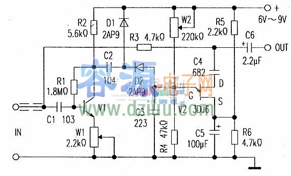 電路原理見下圖。輸八信號分成兩路,一路經R3、C6到輸出端。V2是結型場效應管 href="/dz/21/9918211339.shtml">場效應管,在電路中作壓控電阻使用,它的源極電壓由R5、R6的分壓比確定。C5是旁路電容,微調W2用以調節V2柵極電壓,使其在無信號輸八時略呈反偏,
