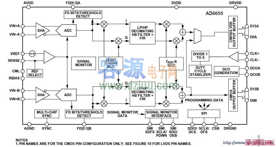 AD6655功能框圖: <<版權(quán)聲明:本文由容源電子網(wǎng)(www_dziuu_com)整理提供,部分內(nèi)容來源于網(wǎng)絡(luò),如有侵犯到你的權(quán)利請(qǐng)與我們聯(lián)系更正!