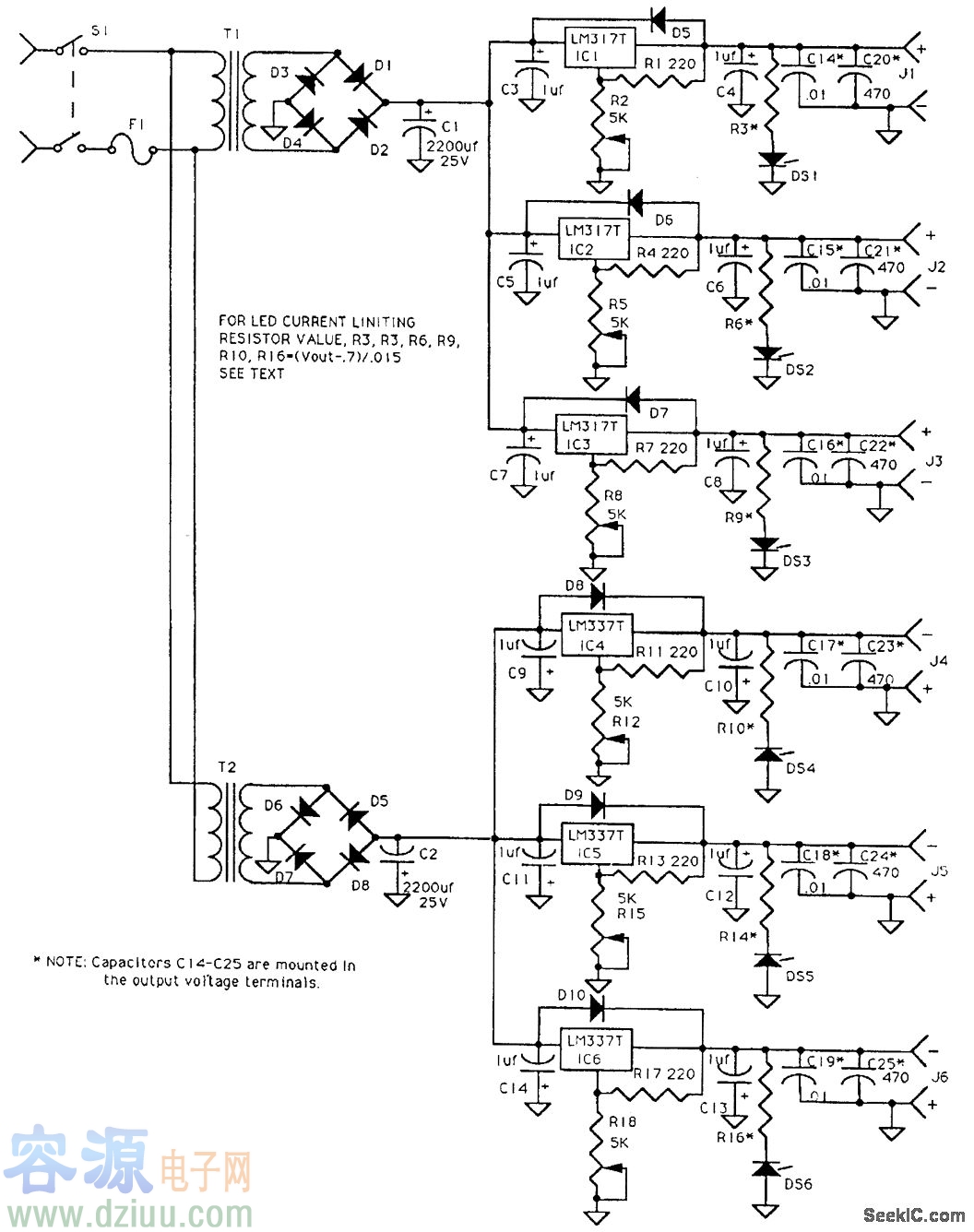 由無源線性集成電路穩(wěn)壓器組成的電源能夠提供+12, +9, +5, -5, -9和-12伏的直流電。T1和T2是12伏,3安的變壓器。 :