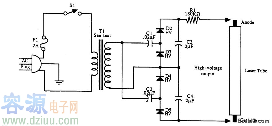 T1是一個60赫茲的120伏到1000伏升壓變壓器。C1, C2, C3, C4, D2通過D5形成一個四倍電壓。最初的電壓是4到5千伏,當激光管發(fā)光時電壓下降。 :